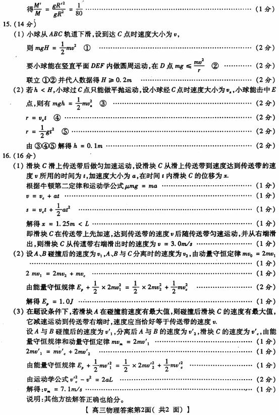 16.(16分)如图14所示为某种弹射装置的示意图,光滑的水平导轨MN右端N处与水平传送带理想连接,传送带长度L=4.0m,皮带轮沿顺时针方向转动,带动皮带以恒定速率v =3.0m/s匀速传动.三个质量均为m=1.0kg的滑块A、B、C置于水平导轨上,开始时滑块B、C之间用细绳相连,其间有一压缩的轻弹簧,处于静止状态.滑块A以初速度