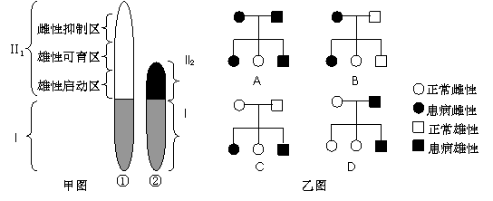 (1)分析甲图,位于Ⅱ1片段上的某基因所控制性状的遗传最可能与乙图的 (填编号)相符,其遗传特点是 。