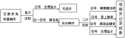 1、(10分)为探究血糖调节的影响因素,设计如下实验流程。实验中5只家兔的注射剂量和生理指标匀按单位体重计算。据图回答:
