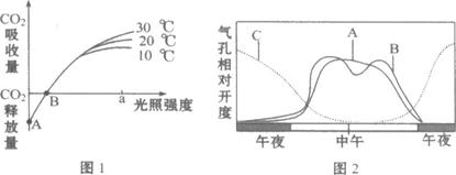 2、(20分)如图1表示某植物光合作用强度与光照强度的关系,图2表示A、B、C三类植物在夏季晴朗的一天中气孔的开放情况。请据图分析并回答: