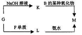 K的溶液与B的某种氧化物反应的化学方程式为 ;L与氨水反应的离子方程式为 ; 一种新型无机非金属材料由G元素和C元素组成,其化学式为 。