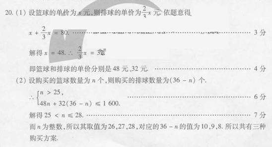 20.(2010河南)(9分)为鼓励学生参加体育锻炼,学校计划拿出不超过1600元的资金再购买一批篮球和排球.已知篮球和排球的单价比为3:2.单价和为80元.