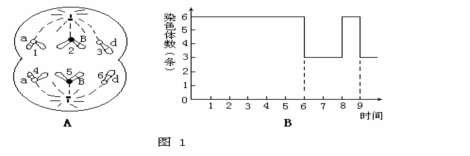 43.(7分)下图1中A是某基因组成为AaBbdd的雌性高等动物细胞分裂过程中某时期的染色体和基因示意图(● 和 〇 表示着丝点,1表示的染色体是X染色体),B是该生物配子形成过程中细胞内染色体数量变化曲线图。请据图回答: