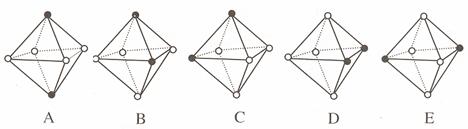 (4)Ni(CO)6为正八面体结构,镍原子位于正八面体的中心,配位体CO在正八面体的六个顶点上。若把其中两个CO配位体换成 NH3 得到新的配合物,则以下物质中互为同分异构体的是 。 ( 填字母编号,任填一组 )( 图中黑点为NH3,圆圈为CO,Ni略去)