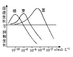 49.右图表示不同浓度生长素对植物根、芽、茎的生长影响,根据下图回答问题: