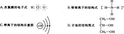 [解析]A中硫离子结构示意图的原子核应为+16;B中NaCl为离子化合物,电子式中要有阴阳离子;C中乙炔的结构简式为CH≡CH