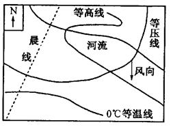 读“中纬度某地某日河流、晨线、风向、等值线的结合图”,回答3-4题。