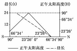 读“沿45°E经线各地某时刻正午太阳高度和昼长分布图”,回答9-10题。