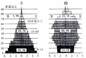 5.上图中的①②两图分别示意两个国家近年的人口构成,这两国家最有可能是 ( )