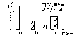 在a、b、c、d四种不同条件下,测得某植物种子萌发时CO2和O2体积变化的相对值如下图。若底物是葡萄糖,则下列叙述中错误的是