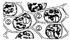 用一片新鲜的苔藓植物叶片制成临时装片,滴加有适量红墨水的0.3g/mL蔗糖溶液,用低倍镜观察装片中的苔藓的细胞,如右图所示状态。①、②处的颜色分别是