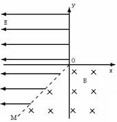 (16分)如图所示,在xoy平面内,第Ⅲ象限内的直线OM是电场与磁场的边界,OM与负x轴成45°角.在x<0且OM的左侧空间存在着负x方向的匀强电场E,场强大小为0.32N/C; 在y<0且OM的右侧空间存在着垂直纸面向里的匀强磁场B,磁感应强度大小为0.1T.一不计重力的带负电的微粒,从坐标原点O沿y轴负方向以v0=2×103m/s的初速度进入磁场,最终离开电磁场区域.已知微粒的电荷量q=5×10-18C,质量m=1×10-24kg,求: