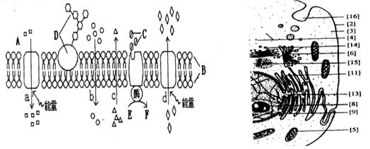 24.(10分)下图为高等动物细胞及细胞膜的亚显微结构模式图(局部),图中A、B、C、D、E、F表示某种物质,a、b、c、d表示物质跨膜运输方式,数字标号表示细胞结构。请据图回答: