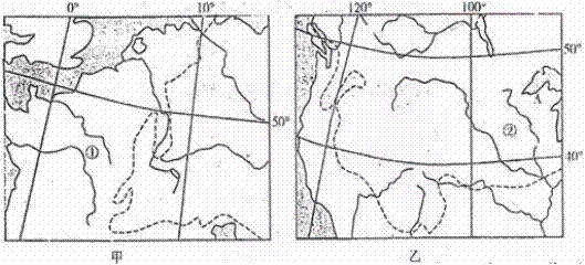 (2)两图所示的50ºN地区,甲与乙比较,甲区域冬季气候有什么特点?试分析其原因。(4分)