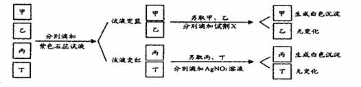 7.现有甲、乙、丙、丁4瓶无色溶液,分别是稀盐酸、稀硝酸、烧碱、澄清的石灰水中的一种,通过下图所示的实验过程可以将它们一一鉴别。其中所加试剂X可能是 ( )