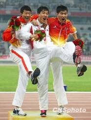 7.10月25日第十一届全运会男子110米栏决赛刘翔夺冠,下图为赛后,刘翔(中)、史冬鹏(右)、纪伟三位获奖选手在颁奖仪式中的瞬间,请为此图配发解说词,要求至少采用两种修辞手法。(不得少于50字)(8分)