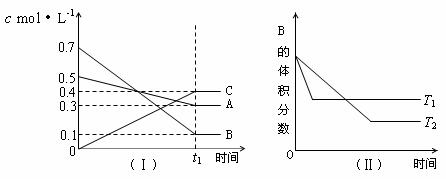 22.T℃时,A气体与B气体反应生成C气体。反应过程中A、B、C浓度变化如图(Ⅰ)所示,若保持其他条件不变,温度分别为T1和T2时,B的体积分数与时间的关系如图(Ⅱ)所示,则下列结论正确的是