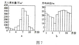 图7表示我国某水库年内逐月入库水量(a)、月均水位(水面海拔)(b)。读图,完成17-19题.