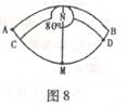 图8中N点为北极点,AB为晨昏线并与80°N纬线相切,ACNDB为赤道,CND为北京时间9时的等太阳高度线。读图回答20-22题。