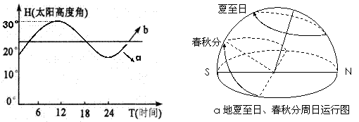 下图为a、b两地北半球夏至日太阳视运行图及a地夏至日、春秋分日运行图。回答28-30题: