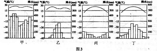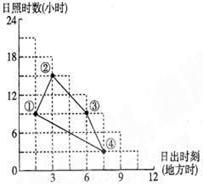 图3是不同地点6月22日的日出时刻与日照时数之间的关系。读图,回答5-7题: