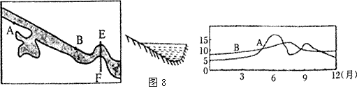 图8中甲是“我国东部河流某河段示意图’’,乙是"EF河段河床示意图",丙是“河流A、B两水文站测得的水位变化图”。据此完成12-14题。