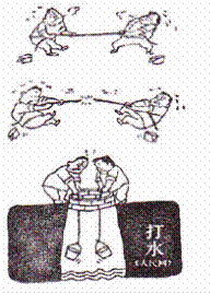 18根据下列要求,为漫画《打水》写一段文字。要求:①概括说明画面主要内容。②点明漫画寓意。③语言简明,字数70字以内。(4分)