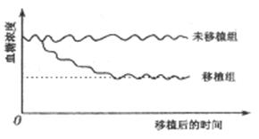 (9分).将小鼠胚胎干细胞定向诱导分化成一种特定的细胞(命名为M细胞),再将M细胞移植到糖尿病模型小鼠(胰岛细胞被特定药物破坏的小鼠)体内,然后测小鼠的血糖浓度,结果如图所示(虚线表示正常小鼠的血糖浓度值)。请回答相关问题: