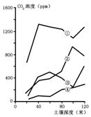 右图中,①、②、③、④分别代表云南路南石林地区人工草坡、无植被耕地、天然草坡、柏树林等不同植被条件下土壤空气中CO2浓度垂直变化曲线。据此完成16-17题。