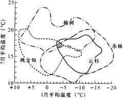 读榆树、云杉、桃金娘、赤杨四种植物生长地l、7月平均气温分布图,回答22-25题。
