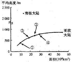 A、①澳大利亚②南美③北美④非洲 B、①南美②澳大利亚③非洲④北美 C、①澳大利亚②北美③南美④非洲 D、①北美②南美③澳大利亚④非洲 32。下面的解释正确的是 A、大陆的面积与平均高度呈正相关 B、六块大陆构成全球六大板块 C、面积为25×106Km2的大陆平均高度约为500m D、南极大陆的高度是包括了冰层厚度的高度