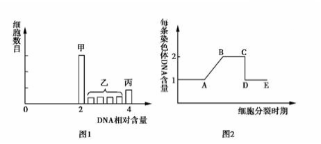 根据每个细胞中DNA相对含量不同,将某种连续增殖的动物细胞归为甲、乙、丙三组,每组细胞数如图1。根据细胞中每条染色体的DNA含量在细胞周期中的变化绘制曲线,如图2。根据图示信息分析,下列结论错误的是:高*考资源网