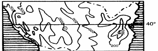 (1)描述图中沿40º纬线从①地形区分别到大陆东、西两岸的降水变化规律及其原因。(4分)