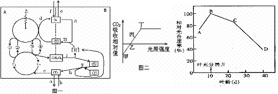 (2)在图二甲状态时,可以发生图一abcdefgh中的a、f、g和 。图二中乙-丙时,限制光合作用的主要因素是 。