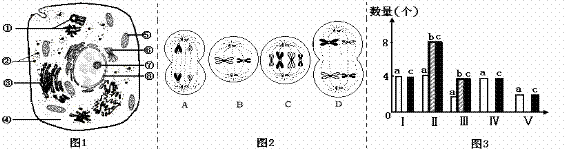 (1)图1细胞中,ATP产生的场所是 [ ] ,能发生碱基互补配对的细胞器是[ ] 。若图1示人体骨髓干细胞,则该细胞可能会发生图2中 [ ] 细胞所示的分裂现象,骨髓干细胞分裂、分化成单核细胞、粒细胞、红细胞、淋巴细胞等细胞的原因是 的结果。