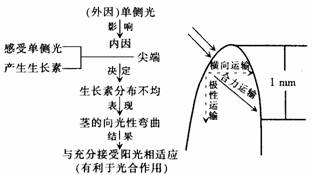 ⑤作用机理:单侧光引起生长素分布不均匀→背光侧多→生长快(向光侧少→生长慢)→向光弯曲。