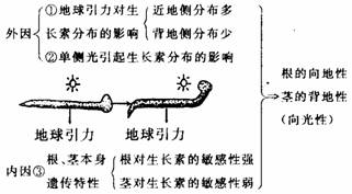 产生的原因:由顶芽形成的生长素向下运输,使侧芽附近生长素浓度加大,由于侧芽对生长素敏感而被抑制;同时,生长素含量高的顶端,夺取侧芽的营养,造成侧芽营养不足。