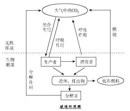 2、大气中CO2的“主要”来源:动植物的细胞呼吸、微生物的分解作用、化石燃料的燃烧。