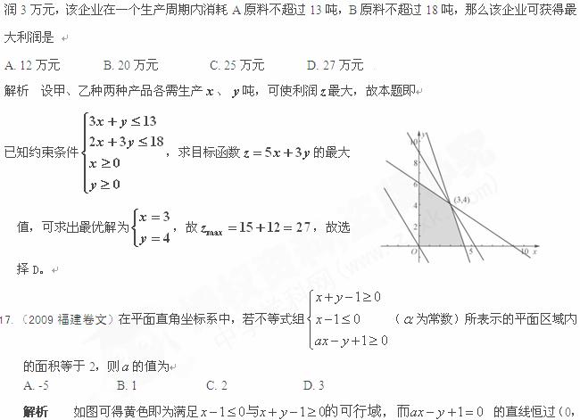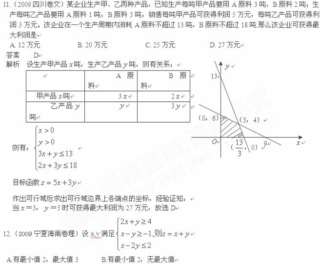 16.(2009四川卷理)某企业生产甲、乙两种产品,已知生产每吨甲产品要用A原料3吨、B 原料2吨;生产每吨乙产品要用A原料1吨、B原料3吨。销售每吨甲产品可获得利润5万元,每吨乙产品可获得利