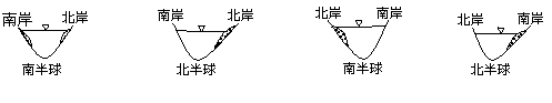 35.下图中,由于地转偏向力的影响,造成平直河道两岸冲刷与堆积的差异(阴影部分为堆积物),若河流由西向东流,则正确的图示是: ( )