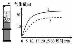 将一个土豆(含有过氧化氢酶)切成大小和厚薄相同的若干片,放入盛有一定体积和浓度的过氧化氢溶液的针筒中(如图所示),若土豆片为4片时,在温度为35℃的条件下,每隔5分钟收集一次数据,根据数据绘制出如图曲线1。利用同样的实验装置,改变某条件后,收集数据可绘制出曲线2。则改变的这种条件是( )