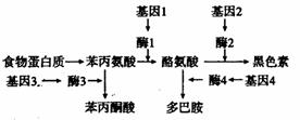 人类白化病和苯丙酮尿症是由于代谢异常引起的疾病,如图表示在人体代谢中产生这两类疾病的过程。由图中能得出的结论有( )