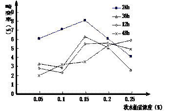 下图表示在不同处理时间内不同浓度的秋水仙素溶液对黑麦根尖细胞畸变率的影响。细胞畸变率(%)=