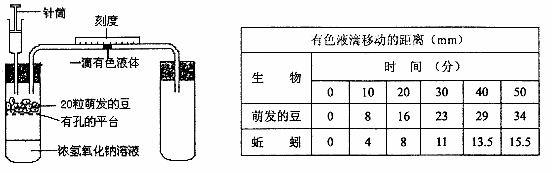 26.(12分)下图装置可以用来测量萌发的种子、小动物所吸收的氧气量。分别以 20 粒萌发的豆和4条蚯蚓为材料,每隔10分钟记录一次有色液滴在刻度玻璃管上的读数如下表所示。