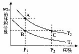 2NO2(g);△H= +57 kJ·mol-1,在温度为T1、T2时,平衡体系中NO2的体积分数随压强变化曲线如图所示。下列说法正确的是![]()