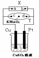 9.右图中X为电源,Y为浸透饱和食盐水和酚酞试液的滤纸,滤纸中央滴有一滴KMnO4溶液,通电后Y中央的紫红色色斑向d端扩散。下列判断正确的是![]()