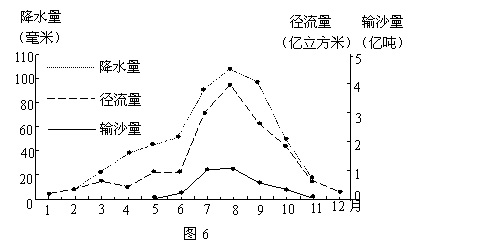 图6为“我国某河流中游水文观测站多年月平均降水量、径流量、输沙量变化图”,读图,回答14-16题。