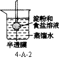 4.如图4-A-2所示,烧杯内装有蒸馏水,下部封有半透膜的长颈漏斗内装有淀粉和食盐溶液,漏斗颈内液面与烧杯内蒸馏水的液面相同。过一段时间后用碘水和硝酸银溶液分别检测蒸馏水中的物质。整个实验过程中所观察到的现象是( )