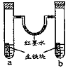 15.如右图装置中,U型管内为红墨水,a、b试管内分别盛有食盐水和氯化铵