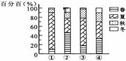 下图是我国长沙、兰州、北京、乌鲁木齐四地春、夏、秋、冬四季降水量占全年降水总量的百分比图,据此回答23-25题。